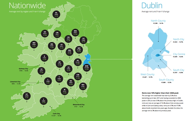 Rents nationally rose by an average of 13.4% in the year to March, with the average monthly rent reaching €1,131 in the first quarter of 2017.